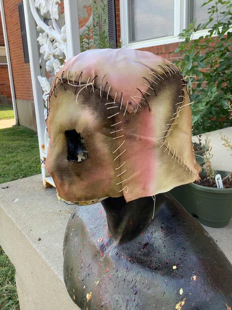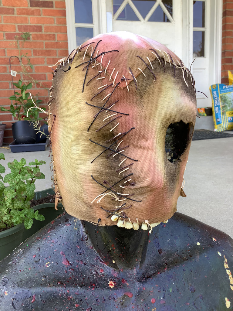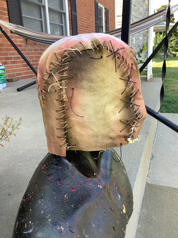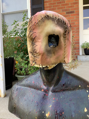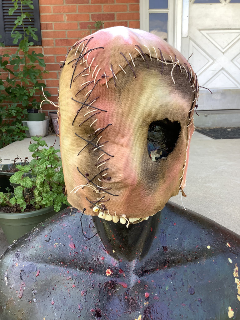 Wearable mask. Larger size. The right eye has no vision. The area under the upper lip is open exposes the bottom of the wearer’s jaw. Laces up the back. Lightweight.